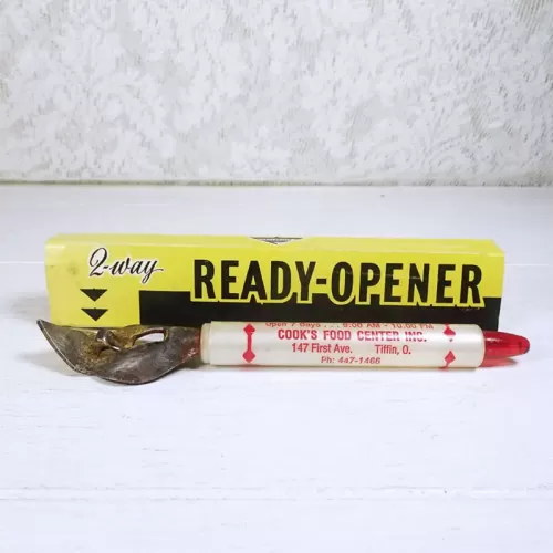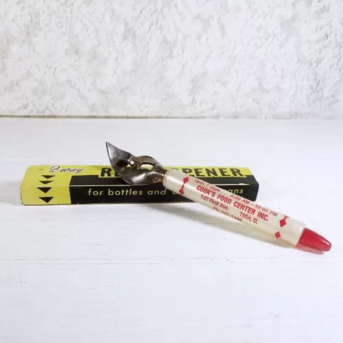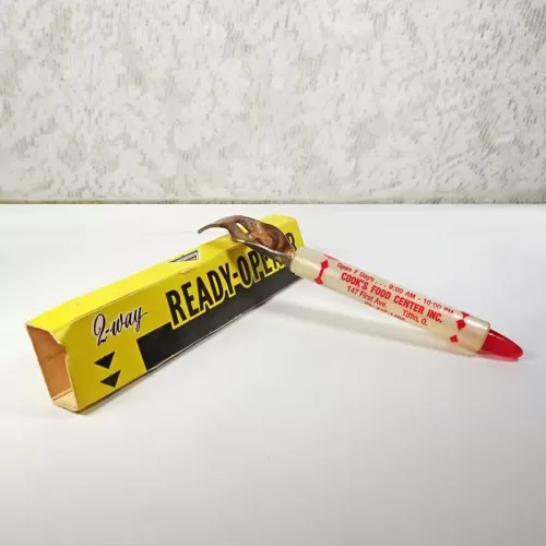 These bottle and can opener combos were promotional advertising items given away by Cook's Food Center in Tiffin Ohio in the 1950s. The family owned grocery may be gone, but over seventy years later their advertising plays on!