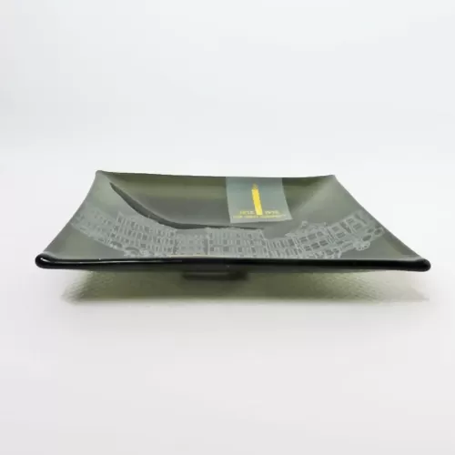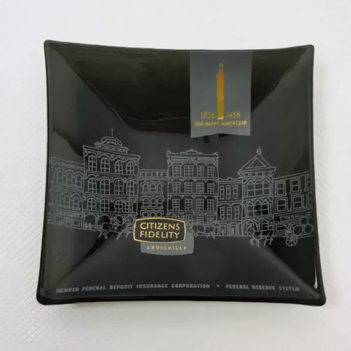 Vintage 1958 Citizens Fidelity Bank of Louisville Kentucky ashtray featuring curved or bent glass with gold accents and gray graphics along with a translucent smokey black background. The top right shows a light gray background with a gold candle with the dates 1858 and 1958 on either side. Under that, also in gold, it reads Our Happy Hundredth.