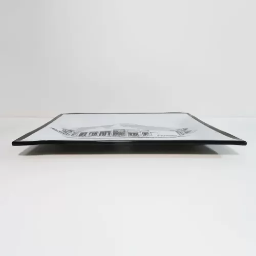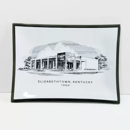 Vintage 1964 Citizens Bank of Elizabethtown Kentucky ashtray featuring curved or bent glass with white graphics sand translucent smokey black background, all showcasing an image of the bank