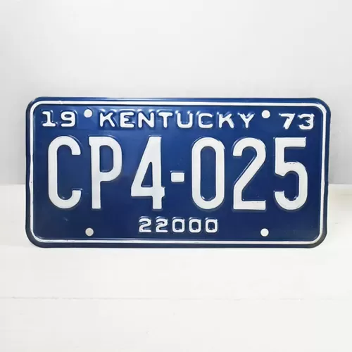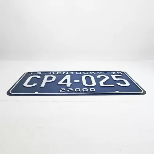 Vintage 1973 Kentucky commerical state license plate with a blue background and white lettering
