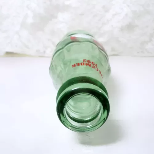 White graphics showing Santa's silhouette and holly sprigs with the words Seasons Greetings are framed in red. December 1993 in the same deep red shows across the neck of the aqua tinted glass Coke bottle.