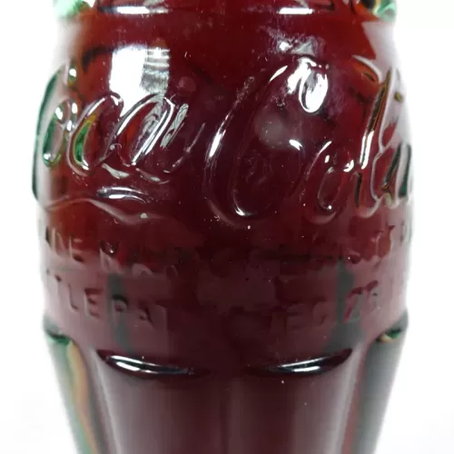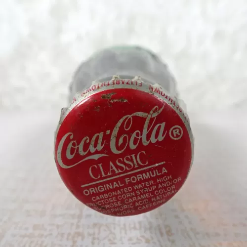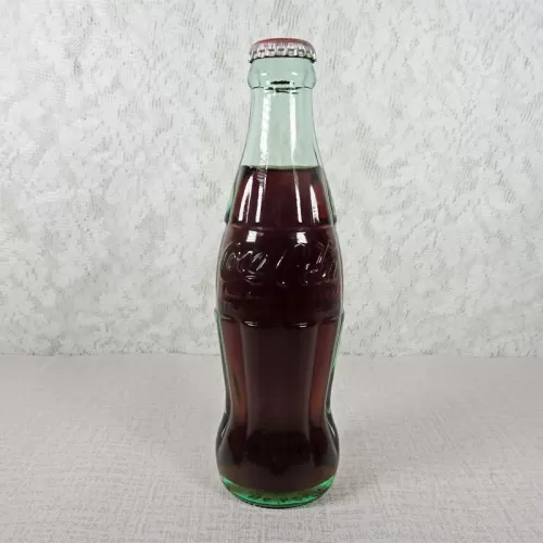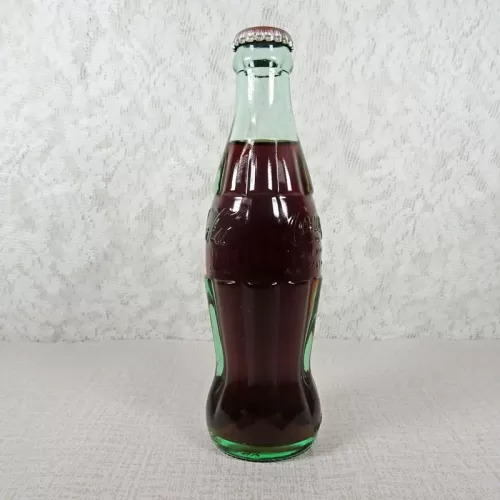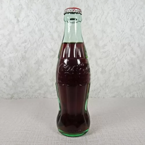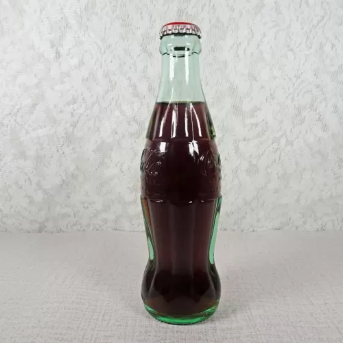 Coca Cola aqua green embossed vintage hobbleskirt glass soda bottle with a red Coca Cola Classic Original Formula crown sealed cap