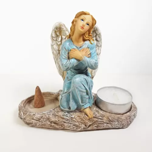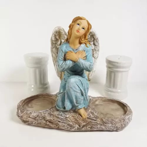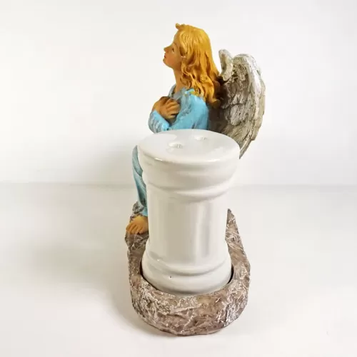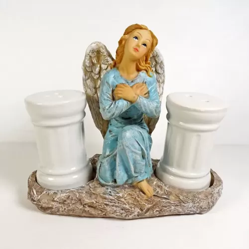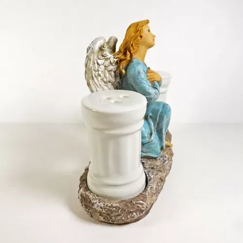 Angel figurine with flowing blonde hair and bare feet. Wearing a blue dress with arms crossed across her chest, she looks toward the heavens. Greek column style ceramic salt and pepper shakers complete the look