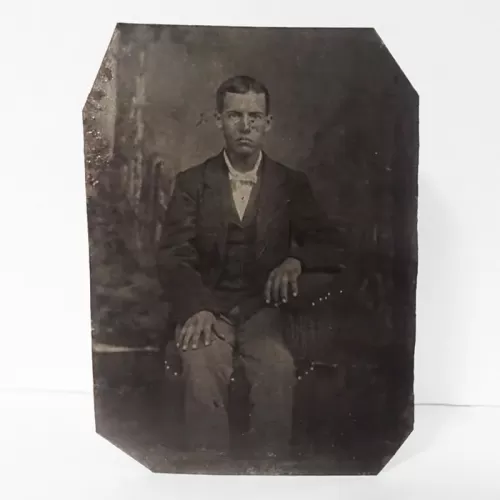 Man sitting wearing a button down vest with jacket sitting on a one armed chair with one hand resting on his upper leg, fingers spread apart. Note how light his fingernails are.