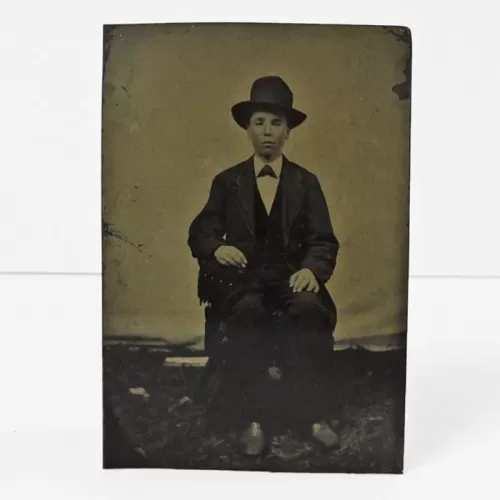 Antique Tintype Photograph Man sitting wearing a button down vest with jacket and a big hat. One arm rest on the chair arm while the other rest in his lap