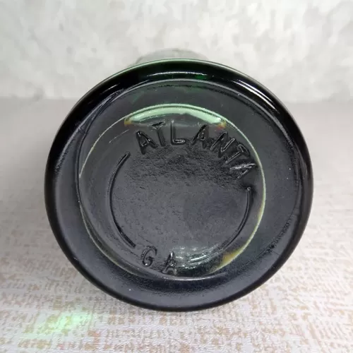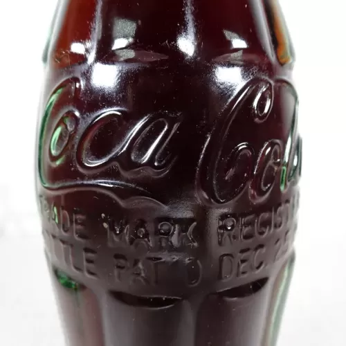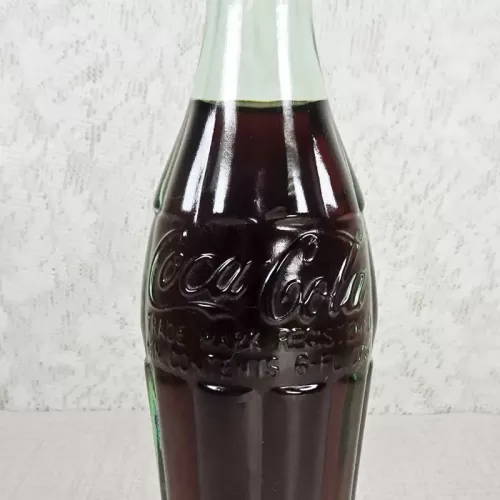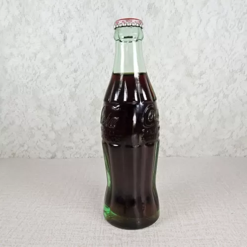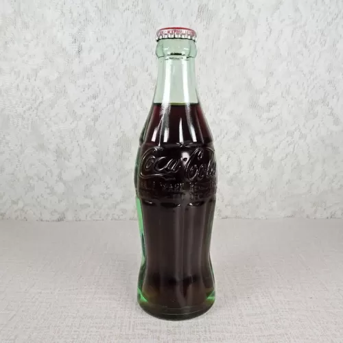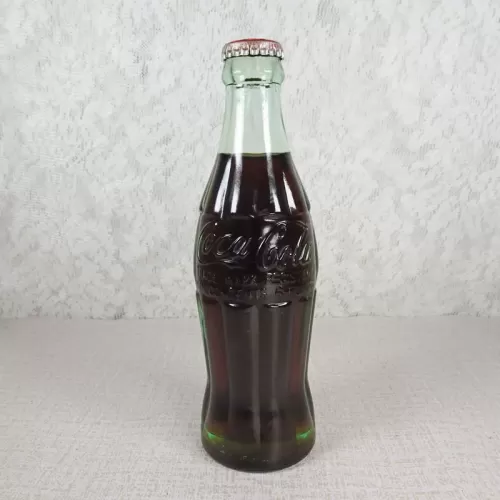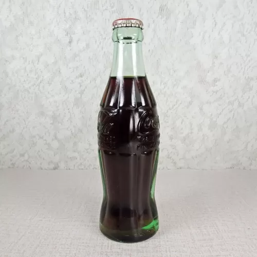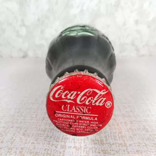 Coca Cola aqua green embossed vintage hobbleskirt glass soda bottle with a red Coca Cola Classic Original Formula crown sealed cap