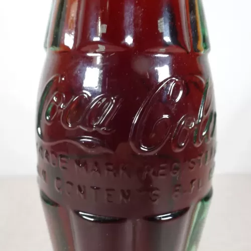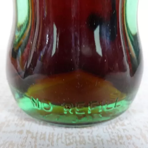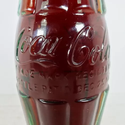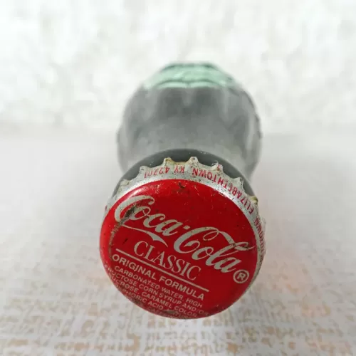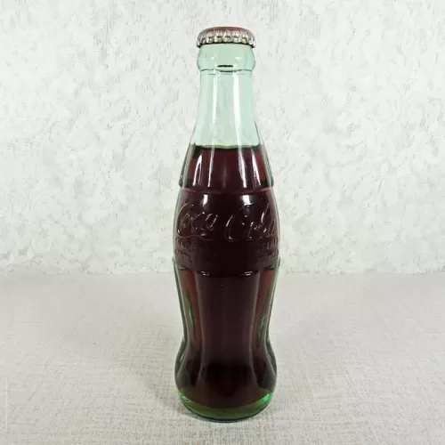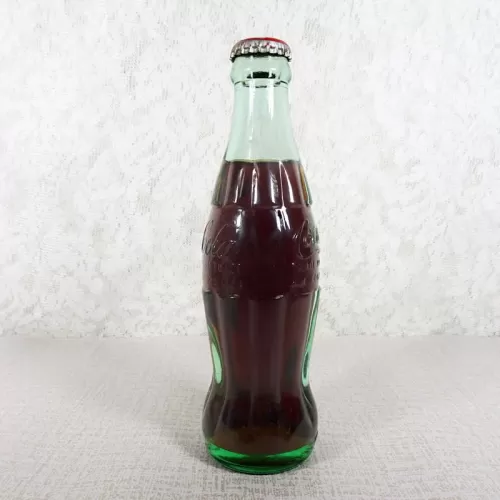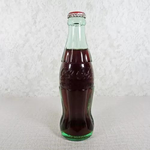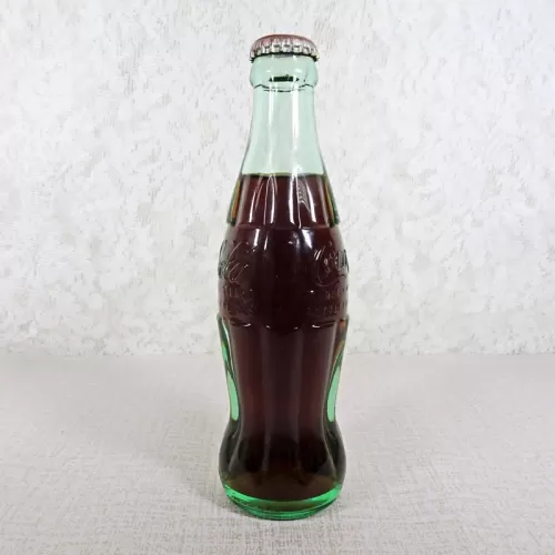 Coca Cola aqua green embossed vintage hobbleskirt glass soda bottle with a red Coca Cola Classic Original Formula crown sealed cap
