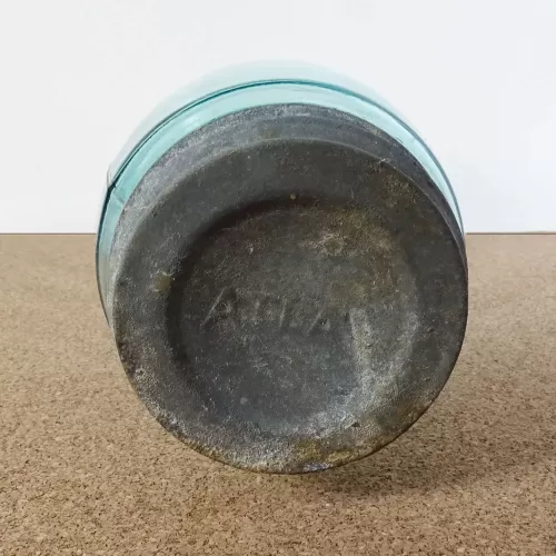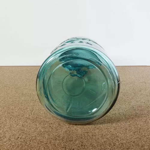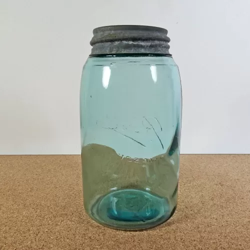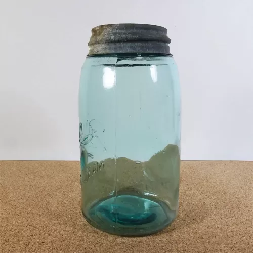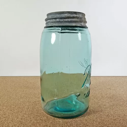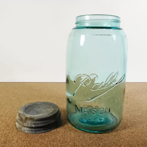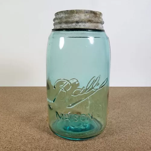 Quart size greenish-blue aqua glass Ball Mason jar featuring a zinc lid and a soft, or smooth, shoulder design. Features Ball Mason raised on the front in the 3L design and a few very small manufacturer bubbles and a larger bubble under the B in Ball