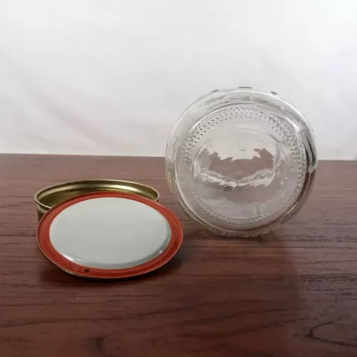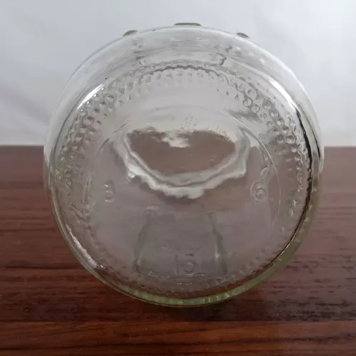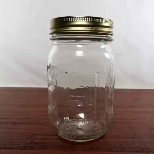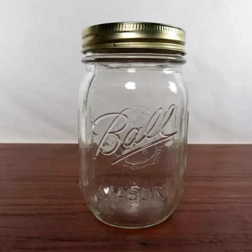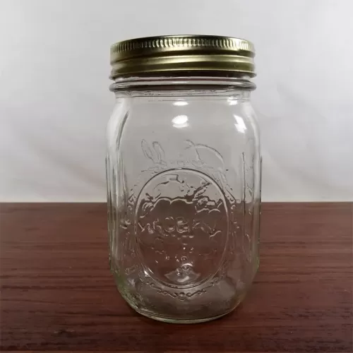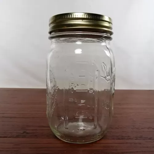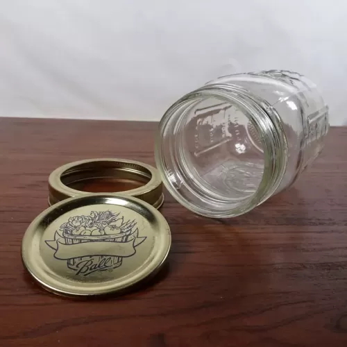 Decorative vintage Ball Mason Jar with various measuring increments raised on the sides of the jar. The gold metal lid shows a basket of fruits and vegtables in blue graphics. The back of the jar shows a similar design as the lid (no basket) in an oval with a wreath edge.