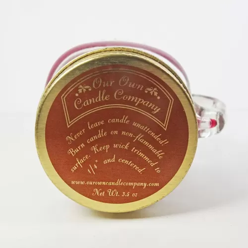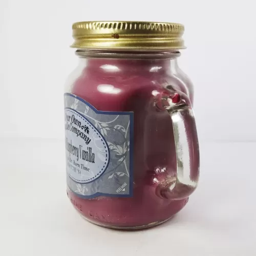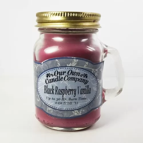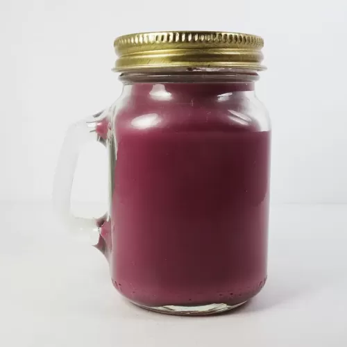 Black Raspberry Vanilla scented candle in a small glass mug with handle