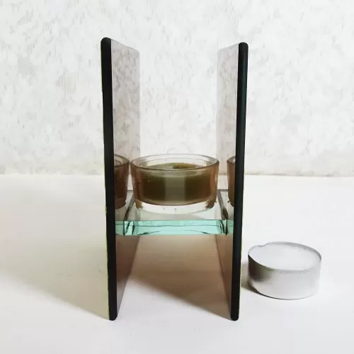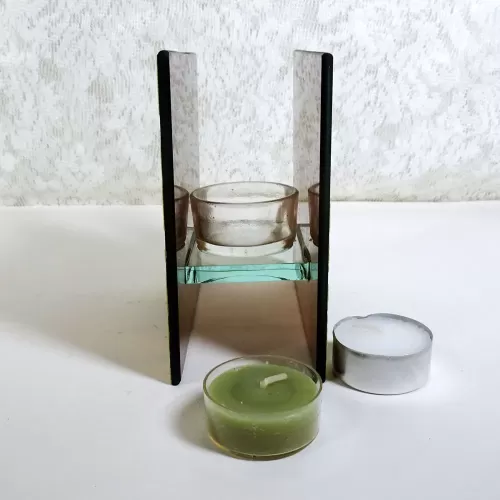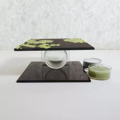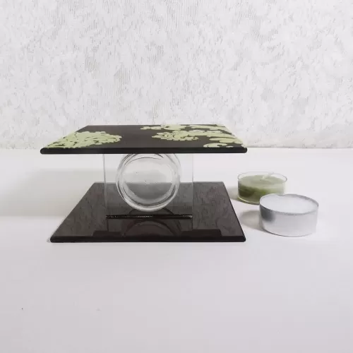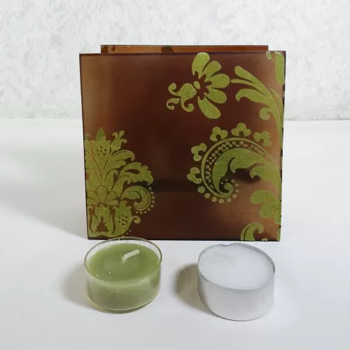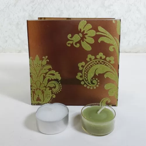 Square tealight candle holder featuring brown frosty glass with lime green velvet swirl accents and smooth plain brown glass inside. The glass cup that holds the tealight candle sits on its own thick glass shelf that connects the two sides together
