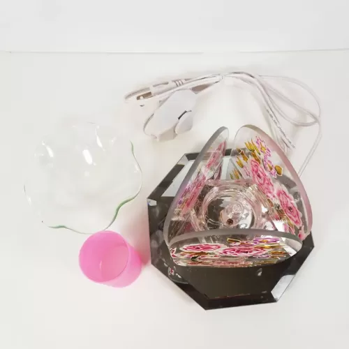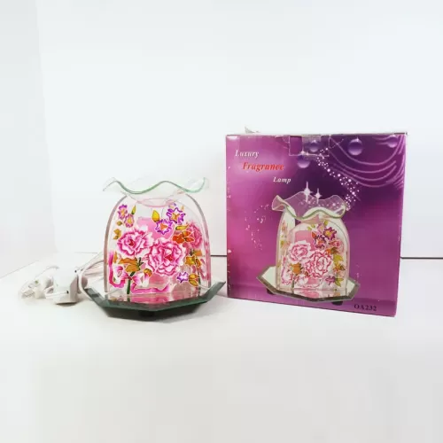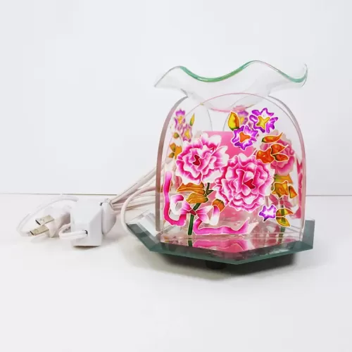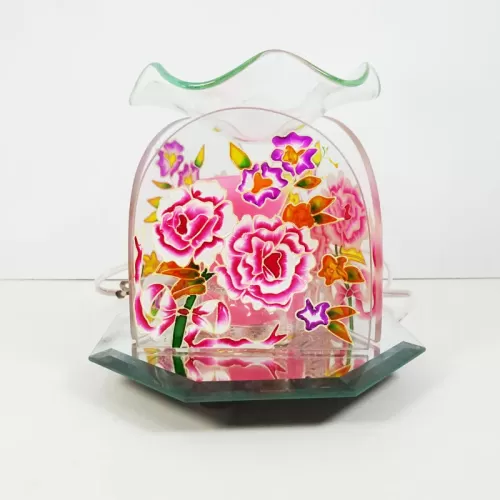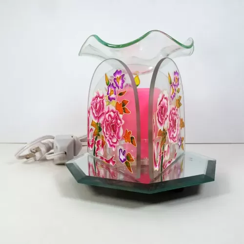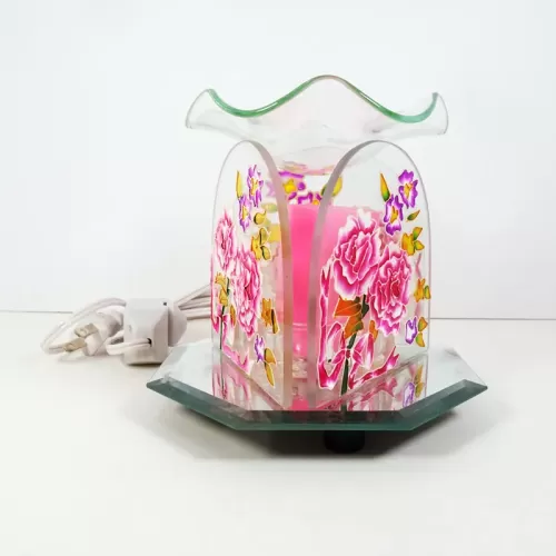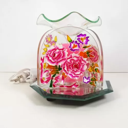 Glass electric scented oil warmer featuring a colorful flower design etched into three clear glass sides with round tops. An octagon mirror base and scalloped bowl for your fragrance choice add to the look.