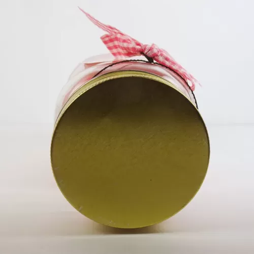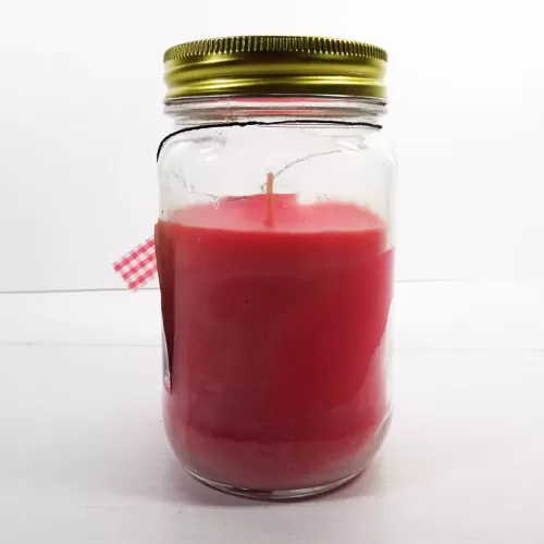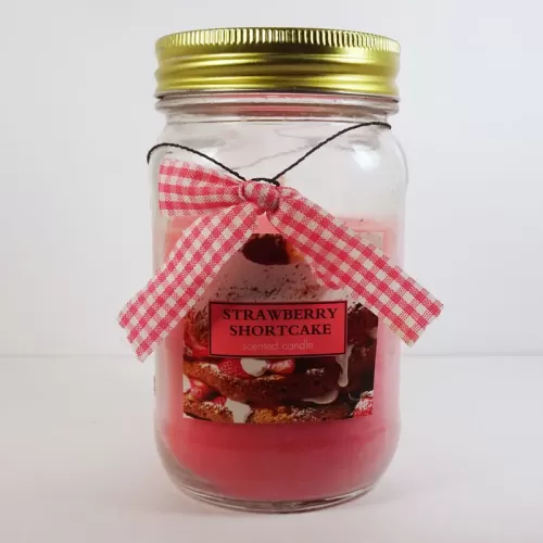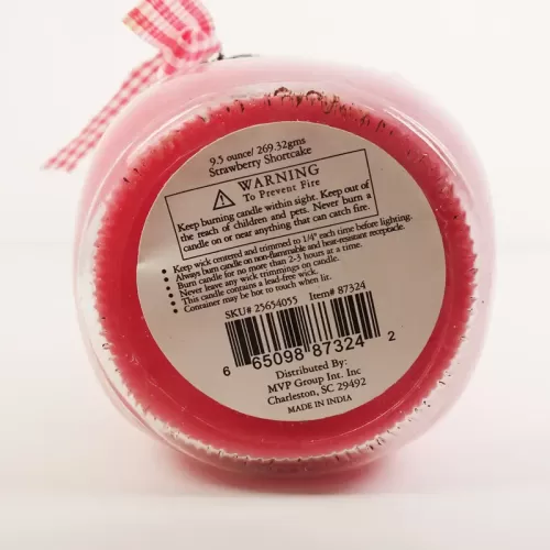 Strawberry Shortcake scented candle in a round glass jar with metal screw lid and side and back cup measurement marks raised in the glass. A pink gingham bow completes the look.