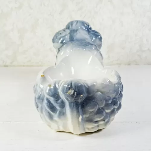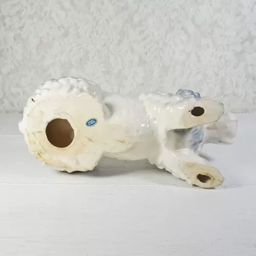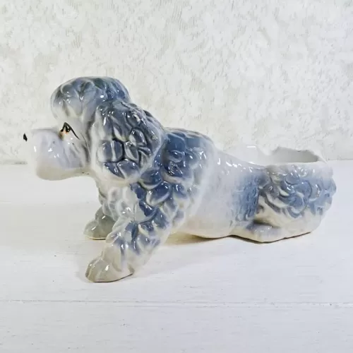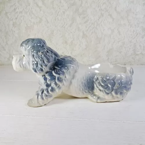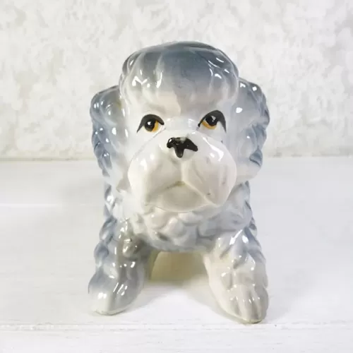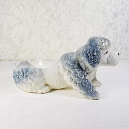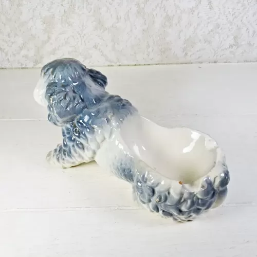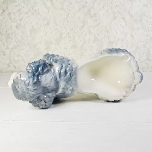 Vintage ashtray featuring a ceramic poodle dog figurine; grayish blue and white in color and two cigarette rests
