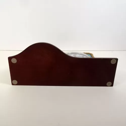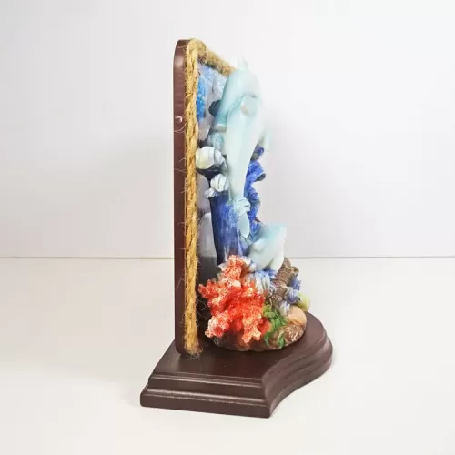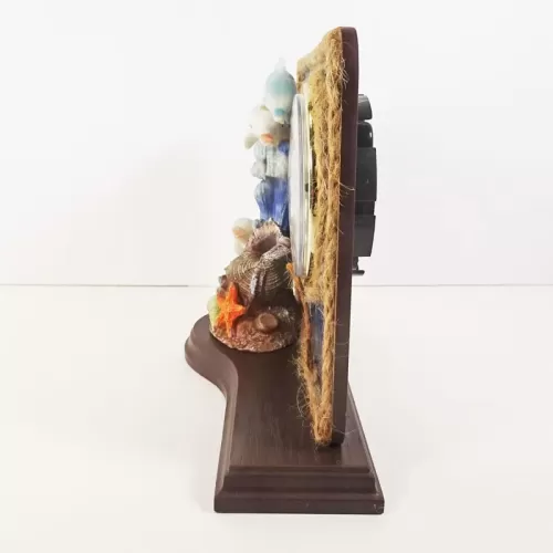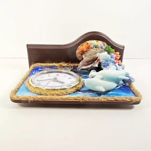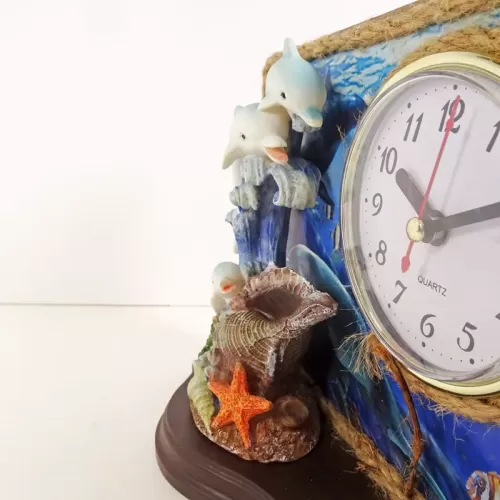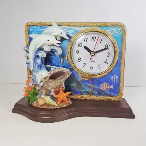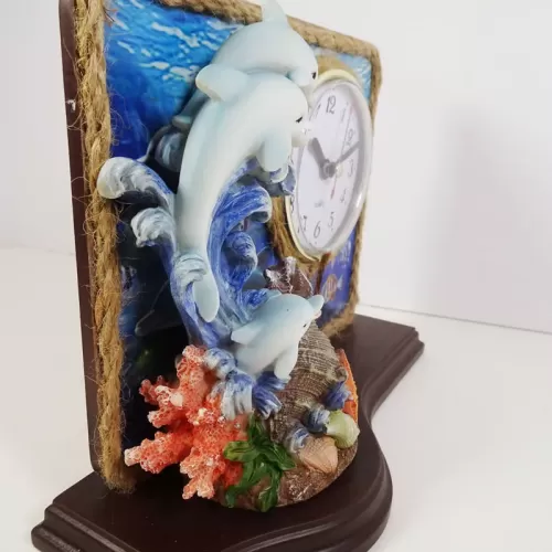 Quartz desk or table clock featuring dolphin figurines playing in the waves with sea shells beneath them and an ocean scene behind them. A rope edge around the scene and clock completes the look.