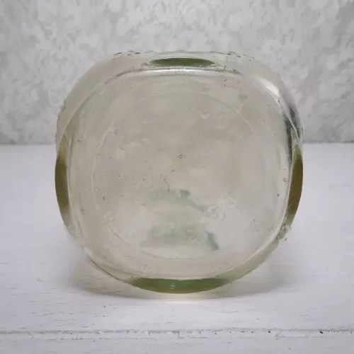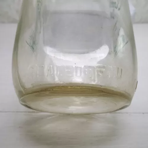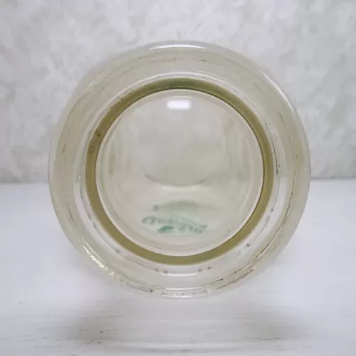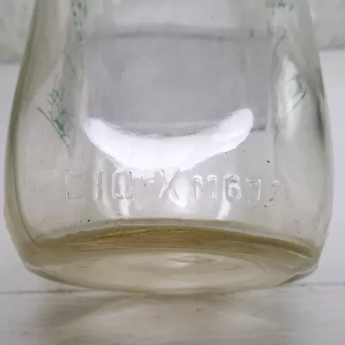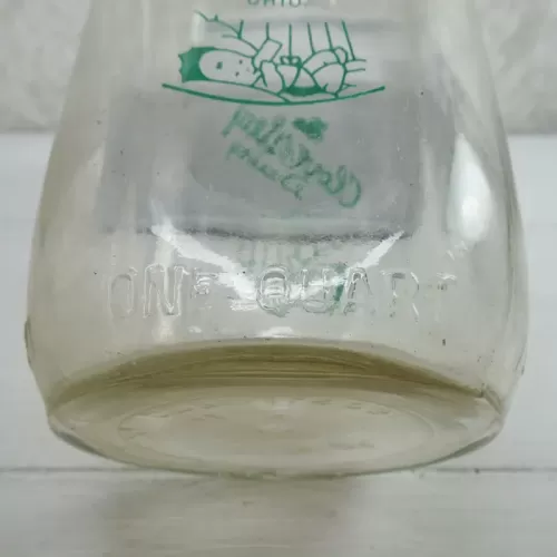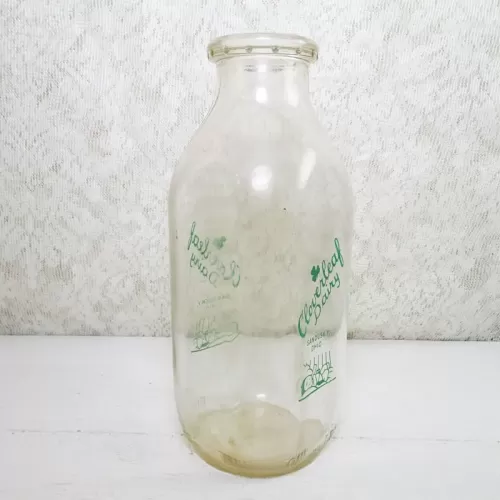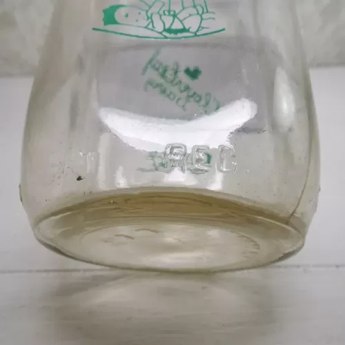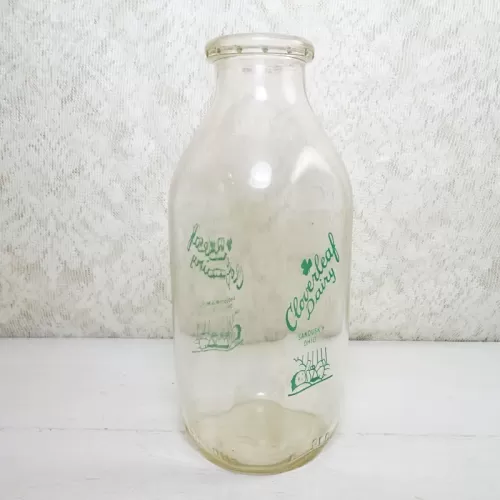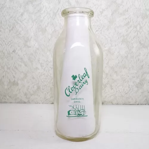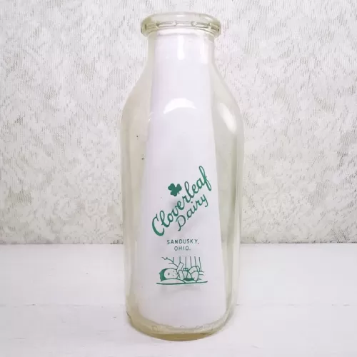 Vintage Cloverleaf Dairy in Sandusky, Ohio one quart pyro ACL glass milk bottle. Graphics show an image of a baby laying in a crib holding a baby bottle. Above that is a clover and the name Cloverleaf Dairy diagonally on the front and back with Sandusky, Ohio below that in a straight line