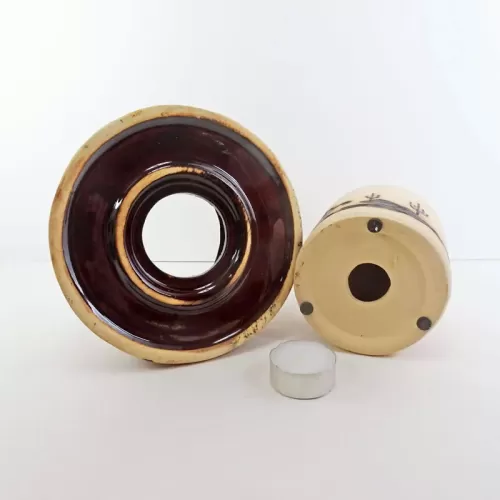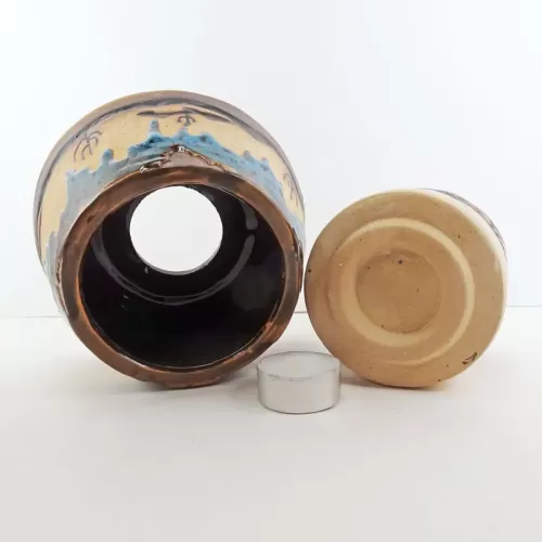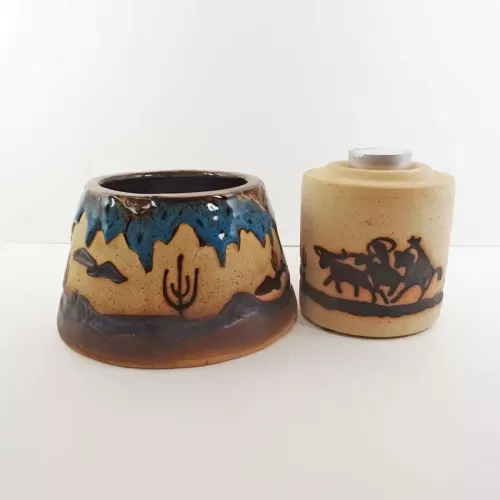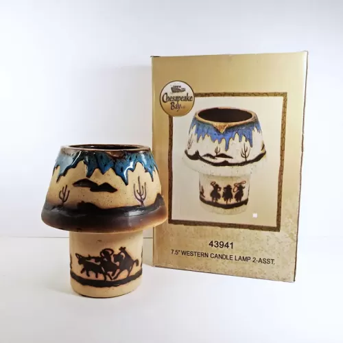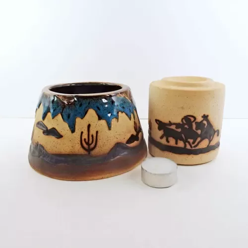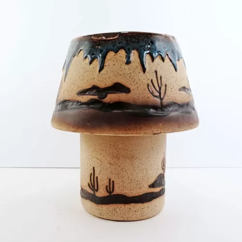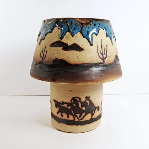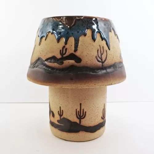 Two piece ceramic candle lamp. Upper piece has a blue oozing like raised layer erupting from the top and a southwest scene of desert and catus beneath