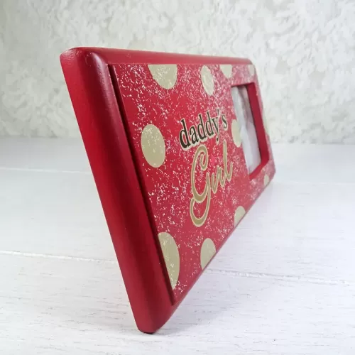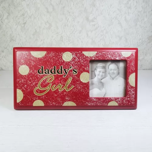 Daddy's Girl wood photo frame with gold, black and white accents on a burgundy background