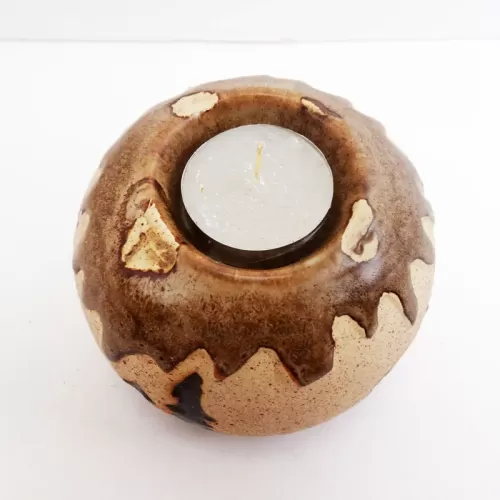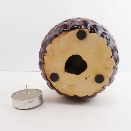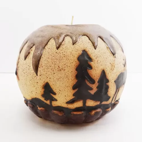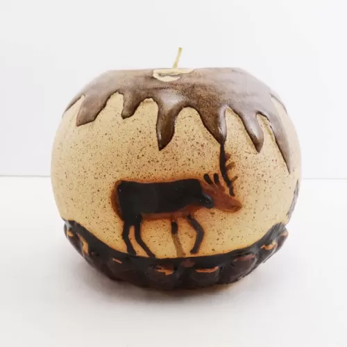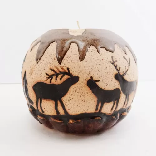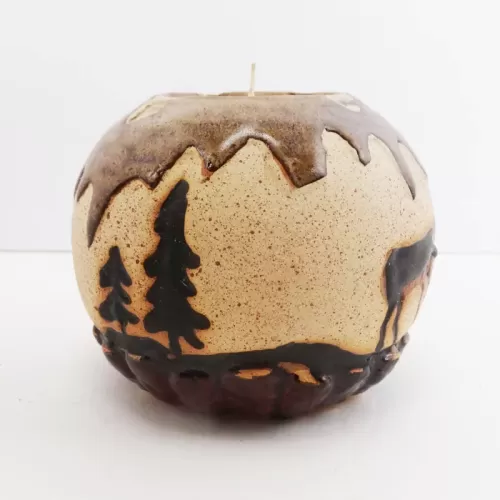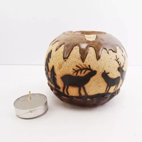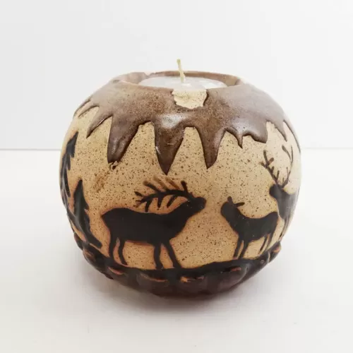 Round ceramic clay tealight candle holder depicting a family of deer, and one lone buck, walking in a forest of pine trees