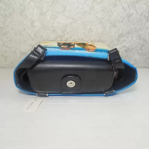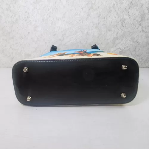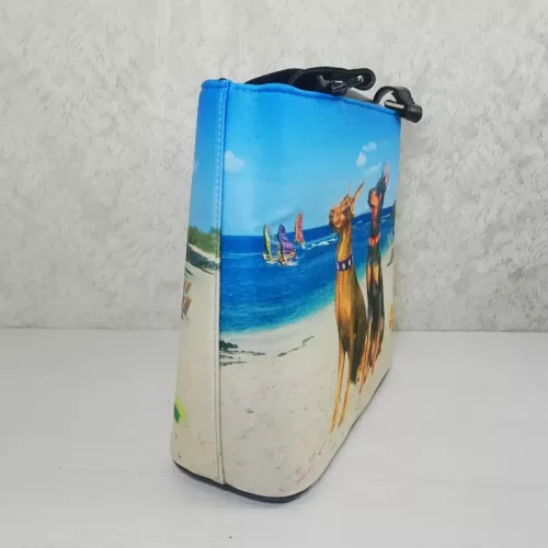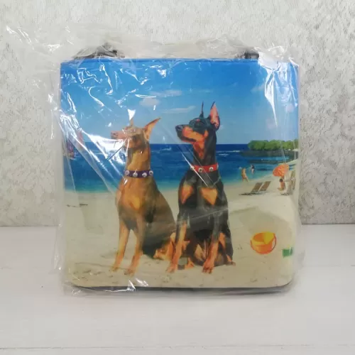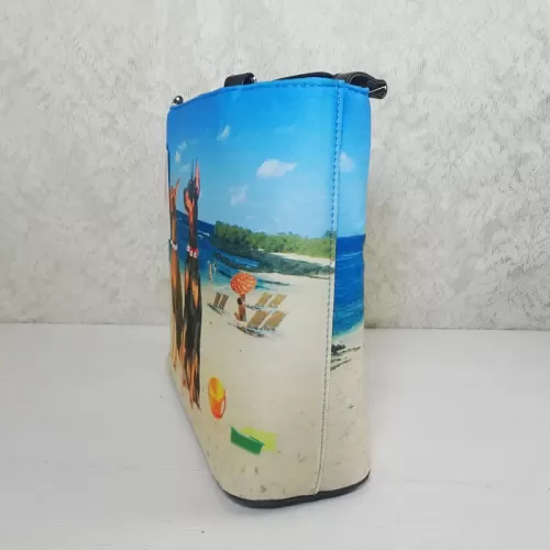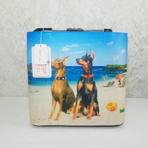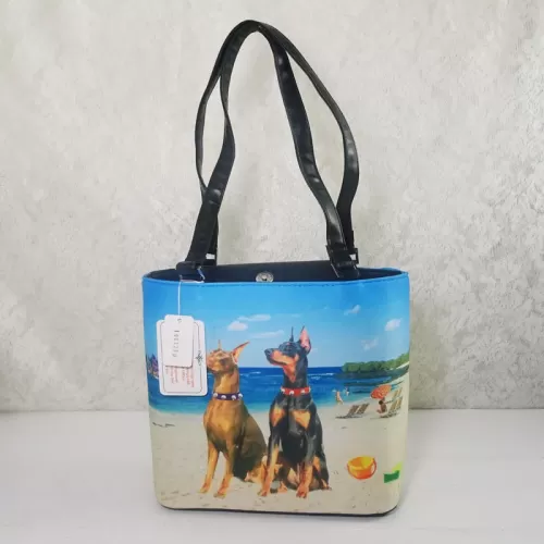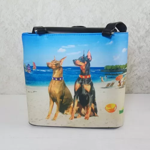 Microfiber fabric bucket style shoulder or tote bag. Image, covering all sides, shows two Doberman Pinschers sitting on the beach with sailboats and beach activity in the background.