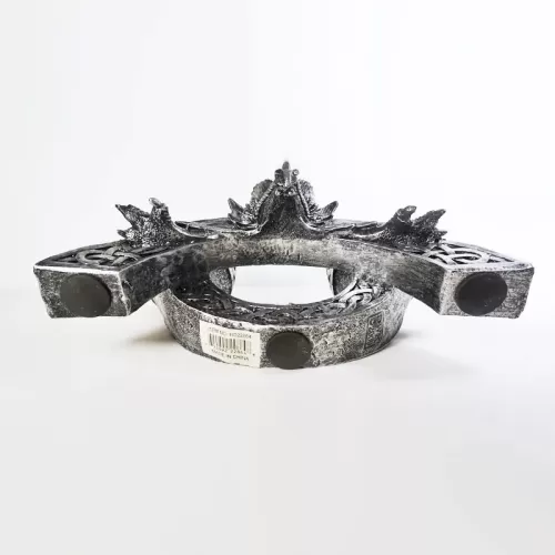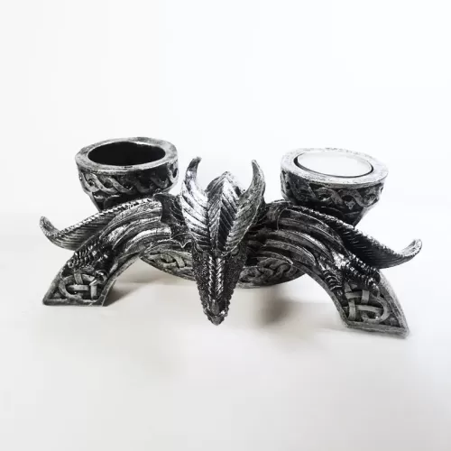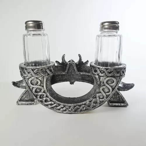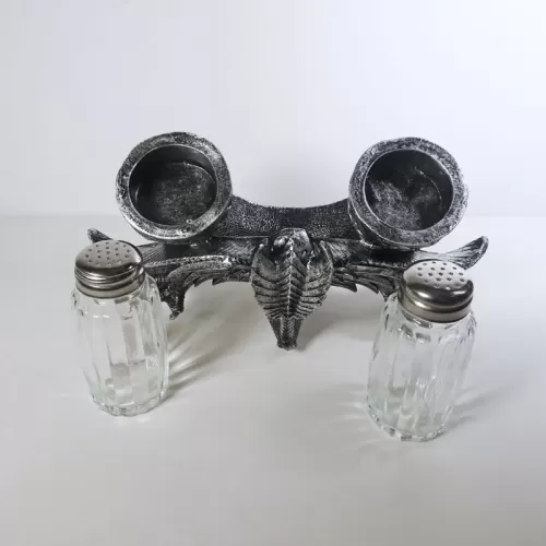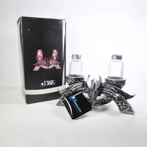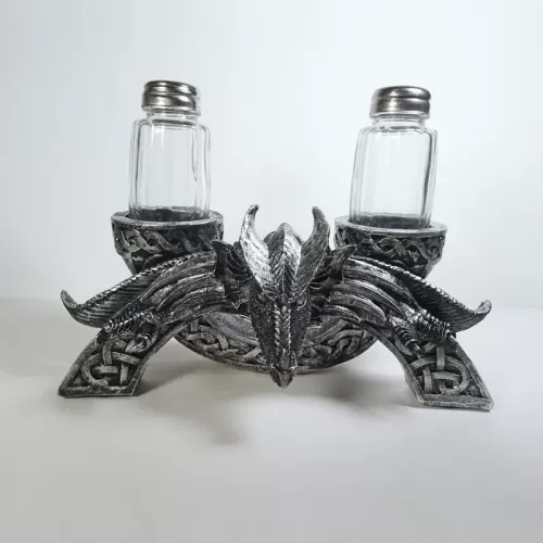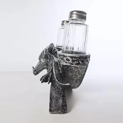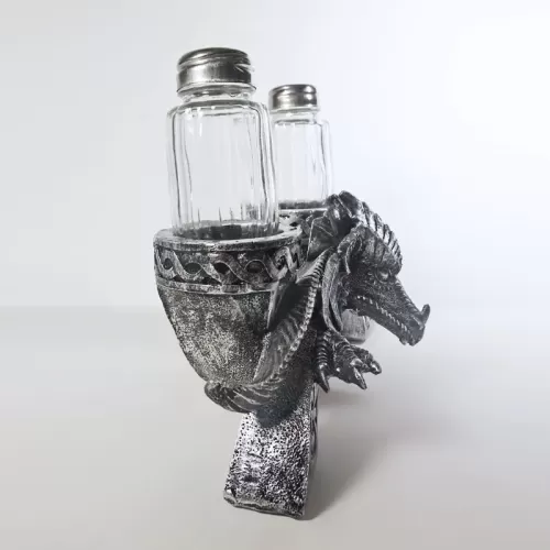 Dragon salt and pepper shaker set featuring a menacing gothic polyresin dragon figurine. Glass shakers with metal tops sit in the cups made into the back. Pads on the bottom protect your counter or table and keep the item from sliding.