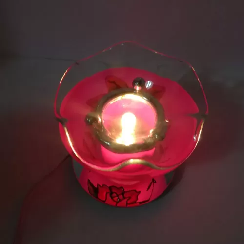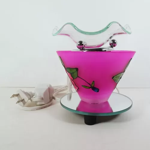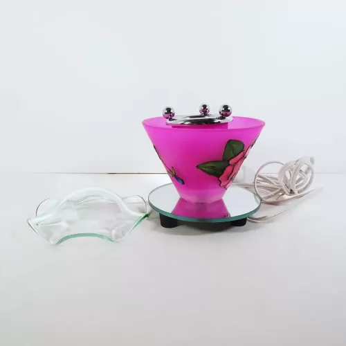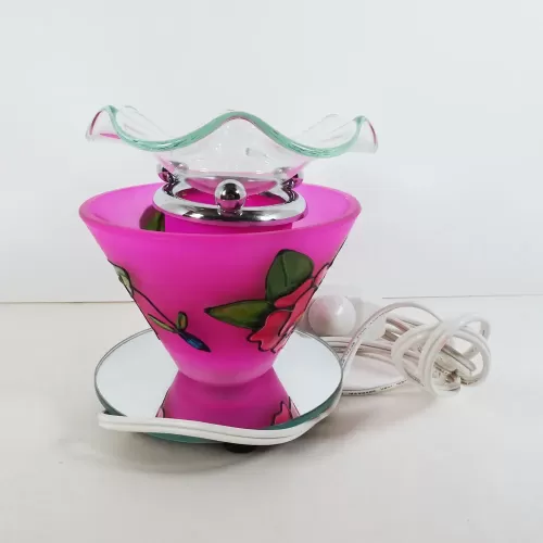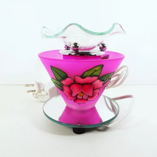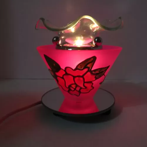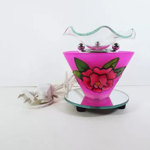 Electric scented oil tart warmer featuring a raised etched rose design on two sides against a deep pink background. The round mirrored base adds to the look