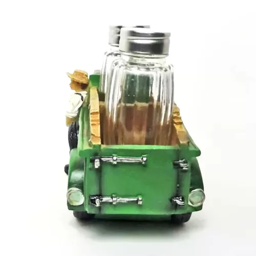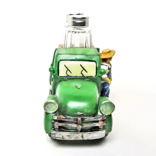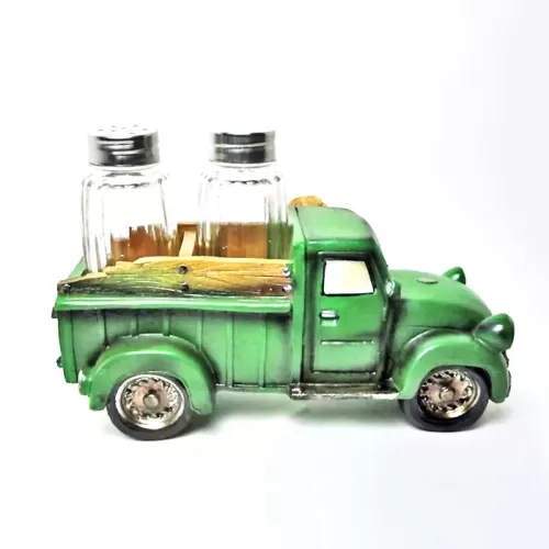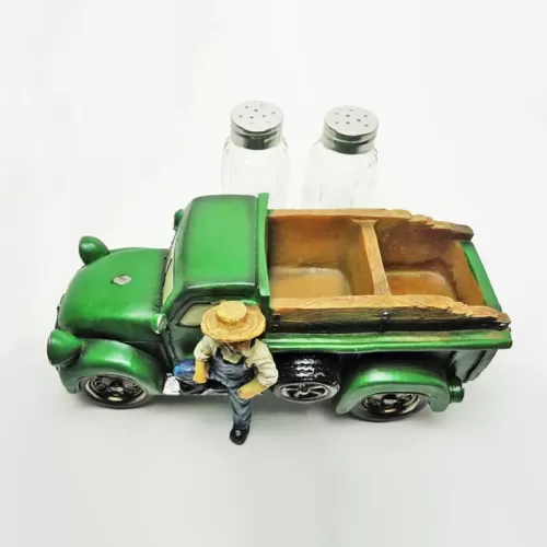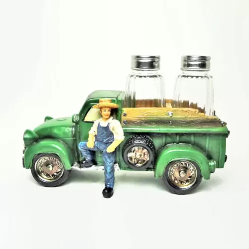 Fine detail polyresin figurine of a farmer in overalls standing next to his green pickup truck. The truck bed holds the glass salt and pepper shakers with metal tops