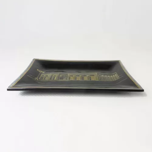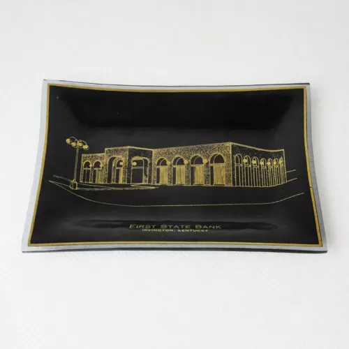 First State Bank in Irvington Kentucky vintage ashtray features curved or bent glass with gold graphics showcasing an image of the bank and a black background. A lighter, translucent edge completes the look
