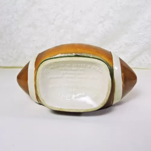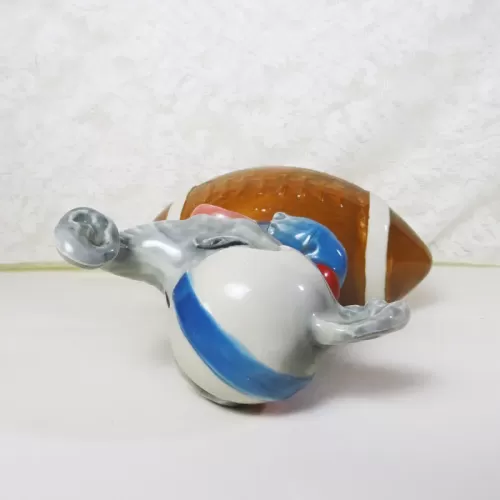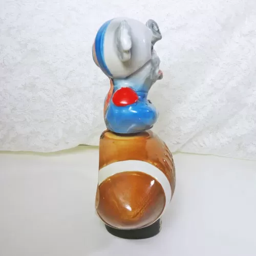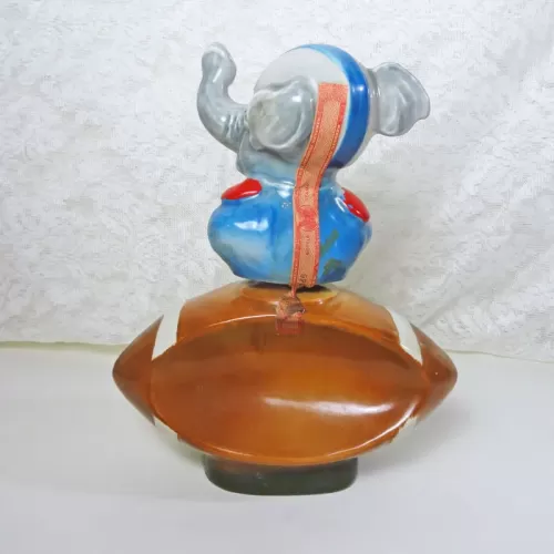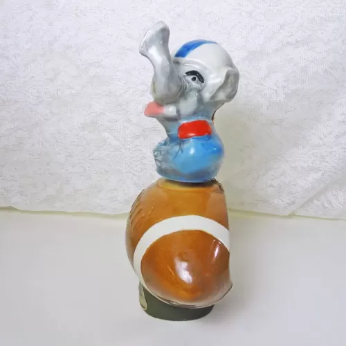 Vintage 1972 Jim Beam whiskey decanter depicting an elephant's head and torso in football garb placed on top of a football
