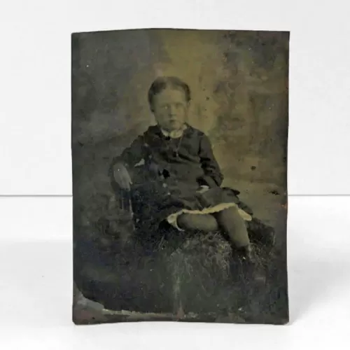 Little girl with crossed legs leaning back in a chair with one arm resting in her lap, the other laying across the chair back