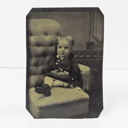 Cute smiling little girl sitting in a big buttoned back chair with her hands on her lap and her legs on the seat of the chair