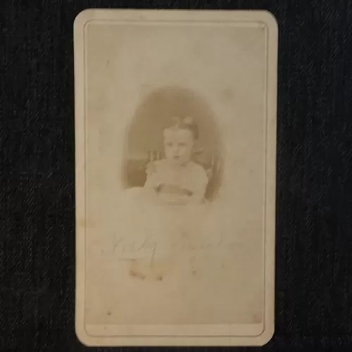 Image of a little girl sitting in a chair wearing a ribboned white dress