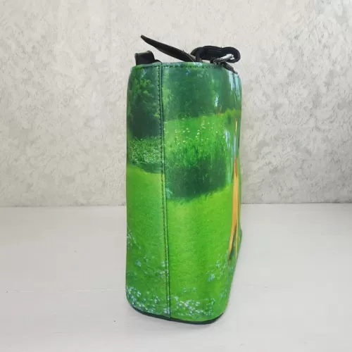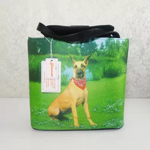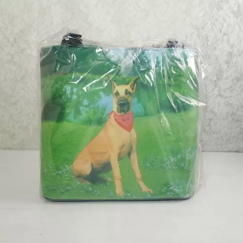 Bucket style shoulder or tote bag. Image, covering all sides, shows a Great Dane, wearing a red bandana, sitting in a field in front of a pond.