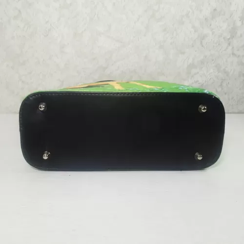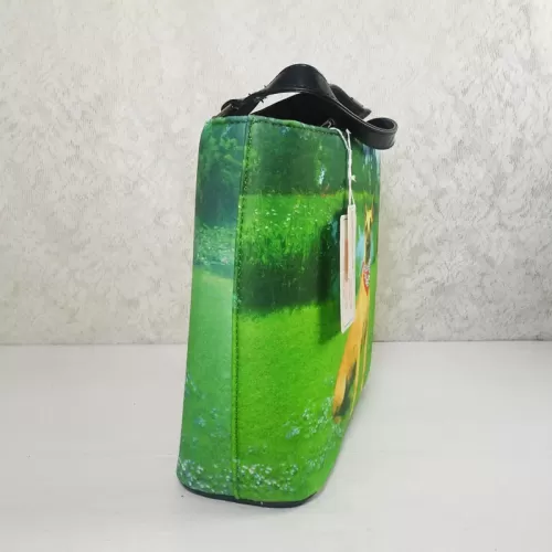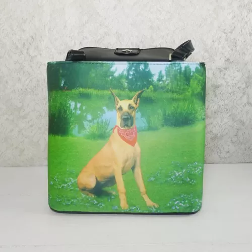 The dog’s bandana on the front of the handbag have bejeweled accents