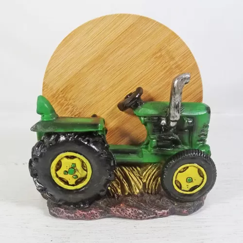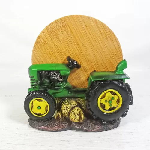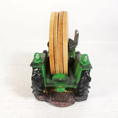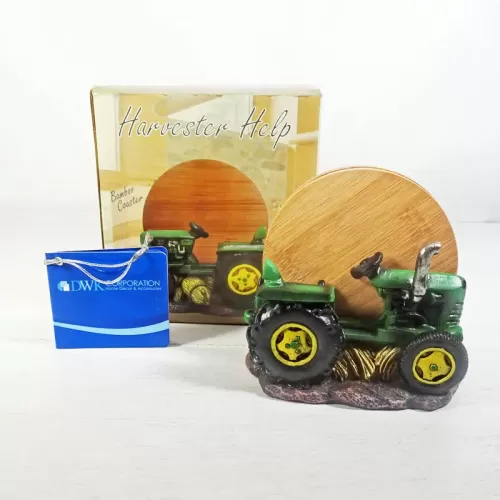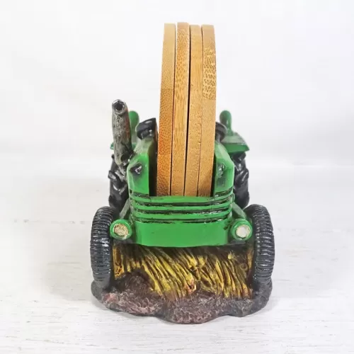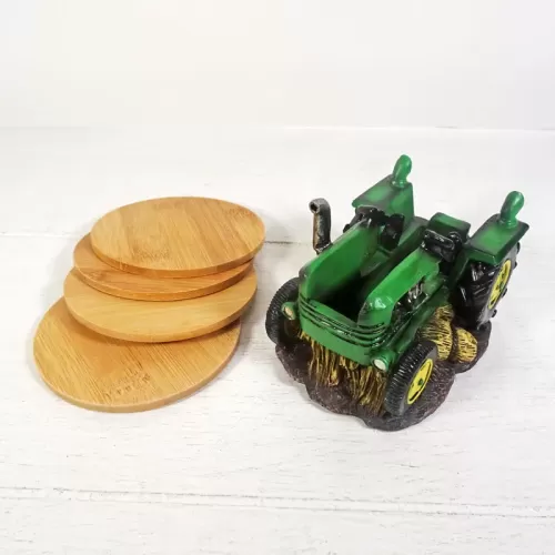 Coaster set featuring a green and yellow polyresin tractor figurine sitting on hay bales and four bamboo coasters