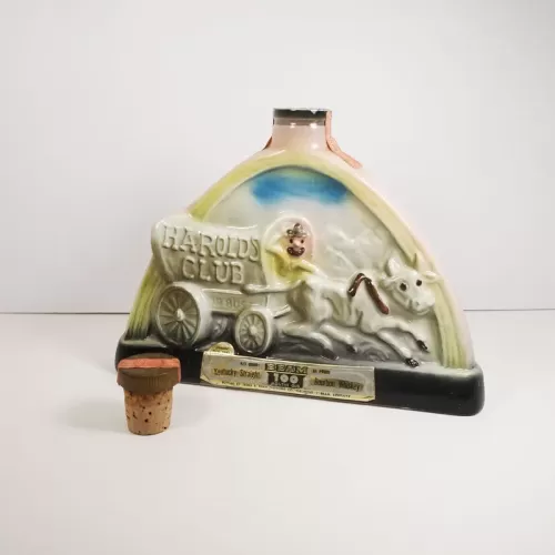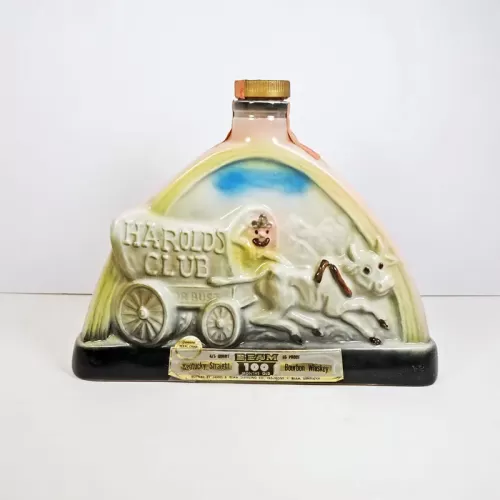 Shaped somewhat like a half oval, this vintage Jim Beam whiskey bourbon decanter, or liquor bottle, depicts a waving cowboy manning a covered wagon, with the words Harold's Club or Bust pulled by an ox with mountains and blue skies in the background.