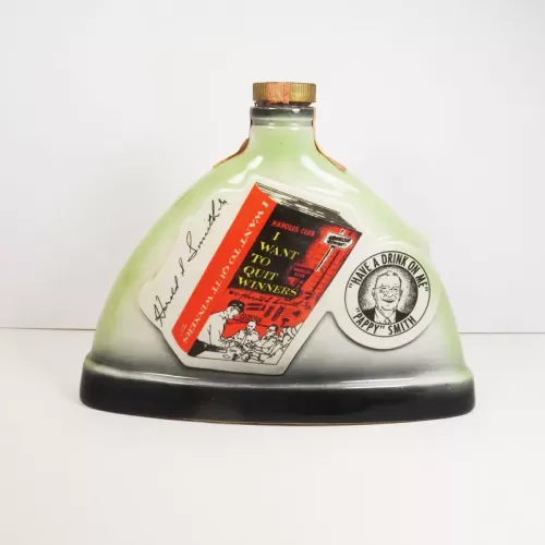 The back shows the cover of Harold S Smith's book I Want to Quit Winners with his signature. Next to this is a picture of Pappy Smith with the quote "Have a Drink on me".