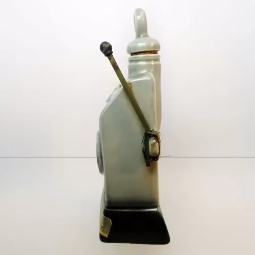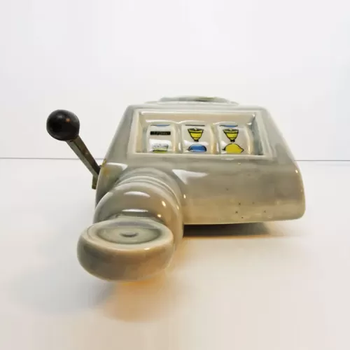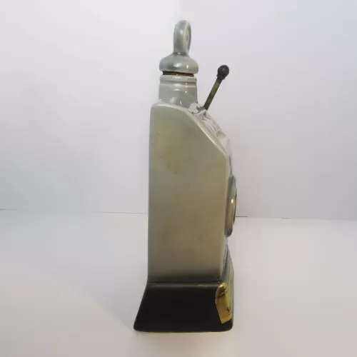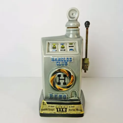 Vintage 1968 Jim Beam decanter shaped like a slot machine or one armed bandit promoting the Harolds Club Reno
