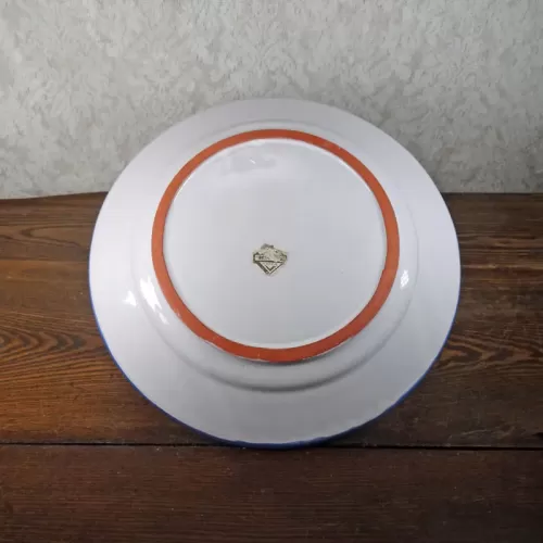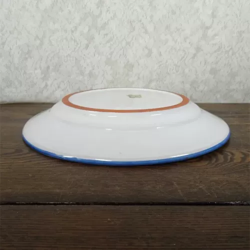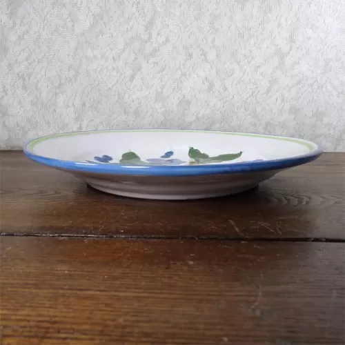 Decorative deep ceramic plate featuring handpainted fruit and flowers on a white background with a beautiful blue painted outer edge and a green inner edge