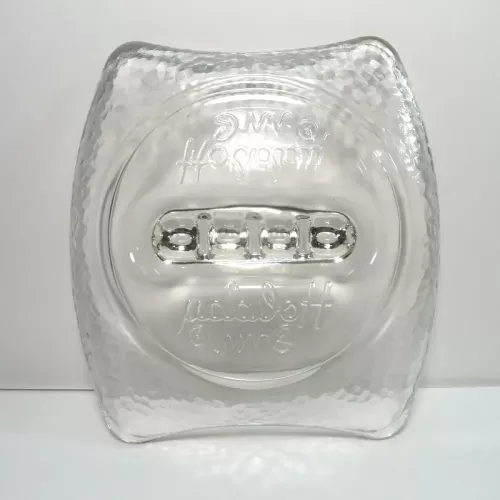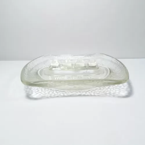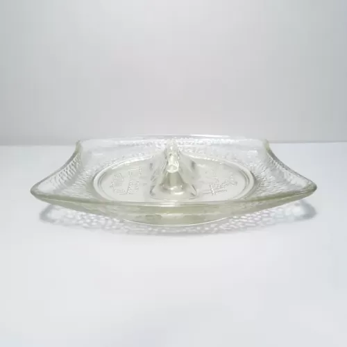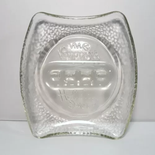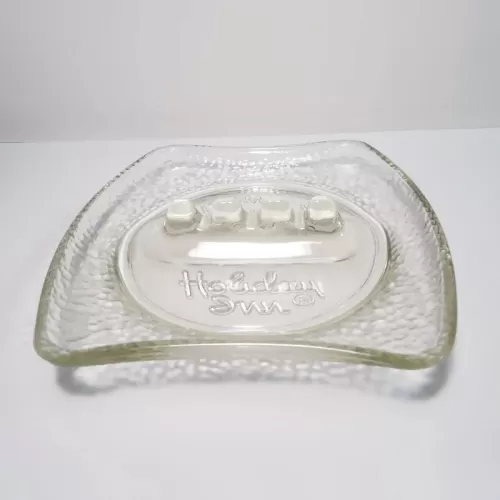 Holiday Inn glass vintage ashtray featuring Holiday Inn etched into the clear glass in cursive writing. The tiny bubble background and three prong cigarette slots in the center add to the look
