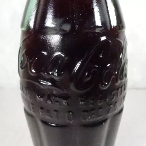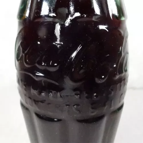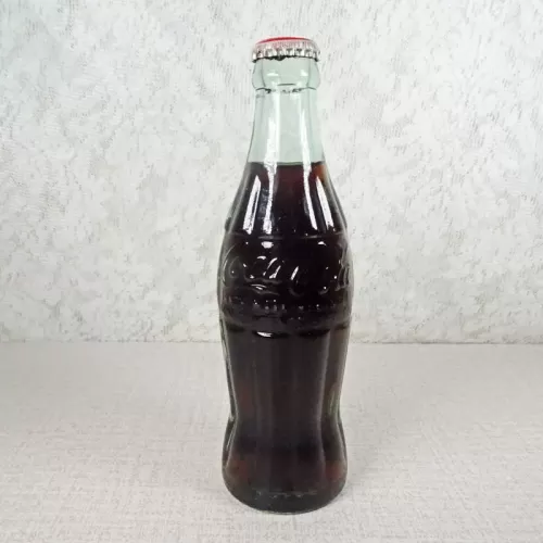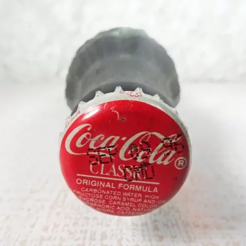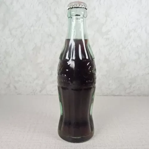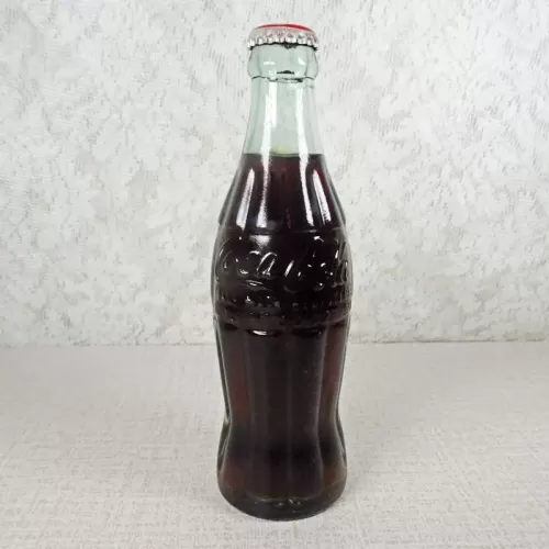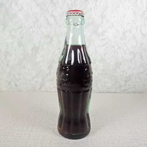 Coca Cola aqua green embossed vintage hobbleskirt glass soda bottle with a red Coca Cola Classic Original Formula crown sealed cap