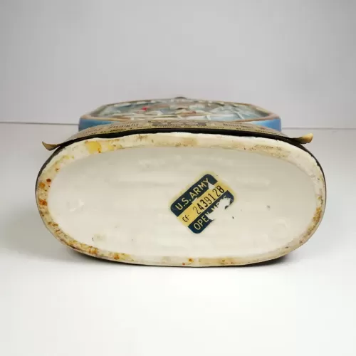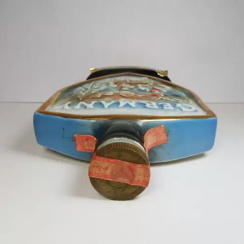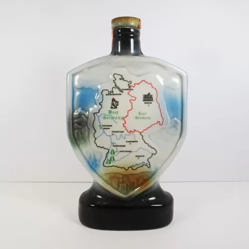 Vintage 1970 Jim Beam bourbon whiskey decanter showcasing a map of East and West Germany highlighting certain areas. Shaped somewhat like Germany's coat of arms and constructed of genuine handcrafted Regal China this is a creation of the James B. Beam Distilling Co.