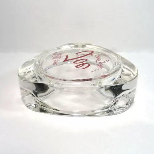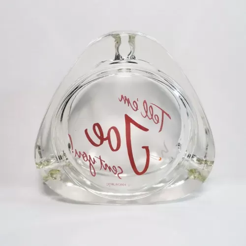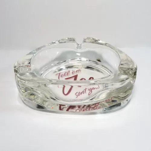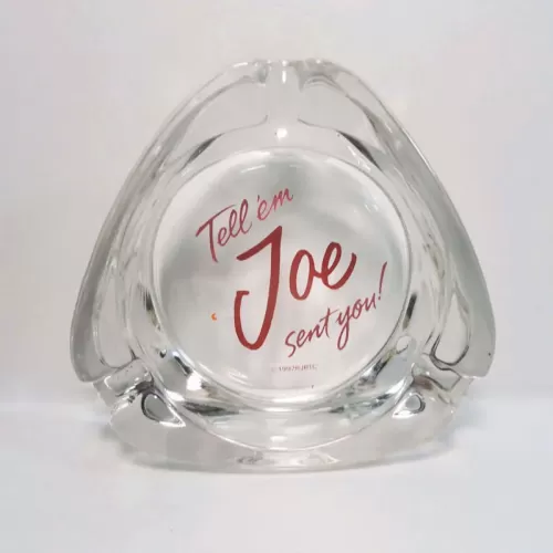 Tell ‘em Joe Camel Sent You vintage 1992 glass cigarette ashtray featuring a clear glass triangular shape with nice colorful graphics. The lit cigarette with smoke graphics adds to the look