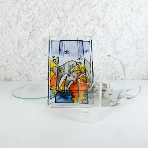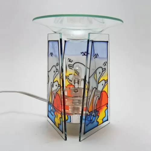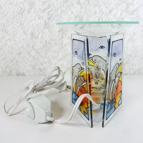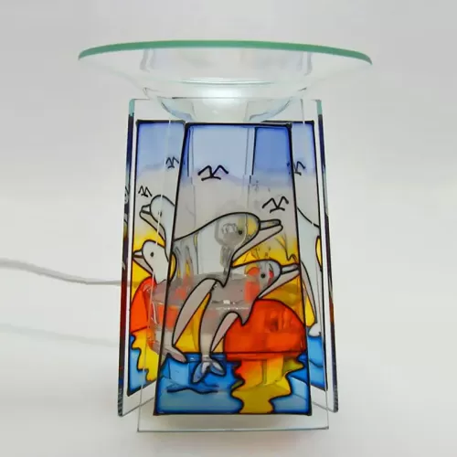 Electric scented oil tart warmer in a triangular shape featuring dolphins jumping out of the water in a stained glass style on three sides.
