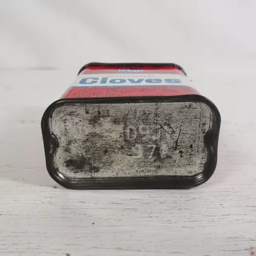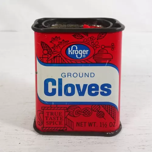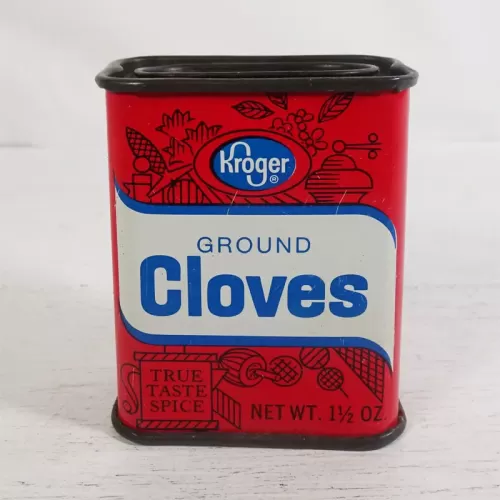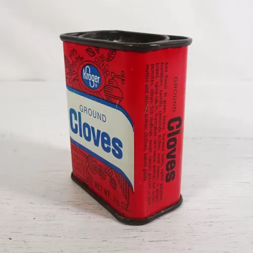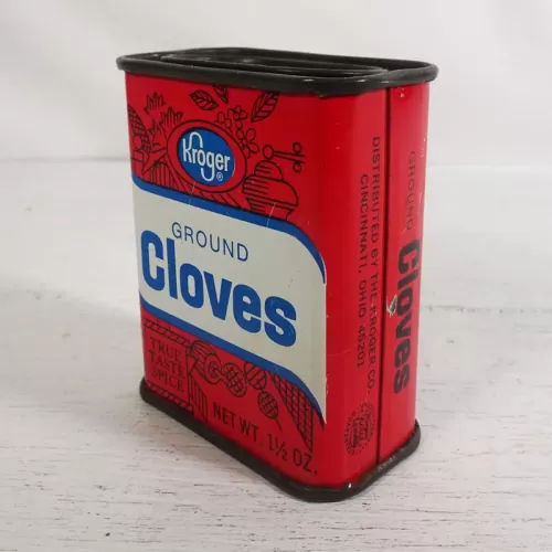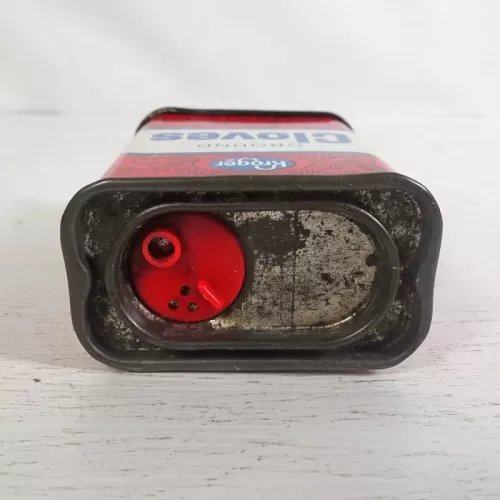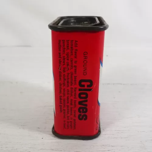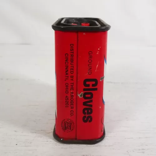 Vintage Kroger Ground Cloves True Taste Spice metal tin with red plastic shaker dial pour top