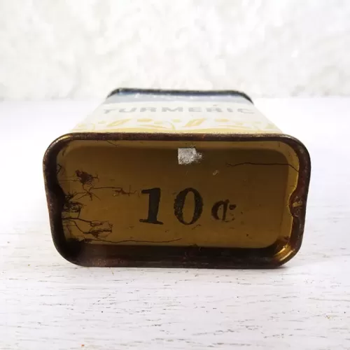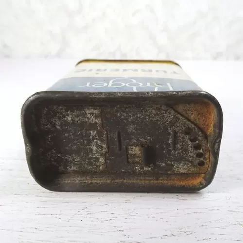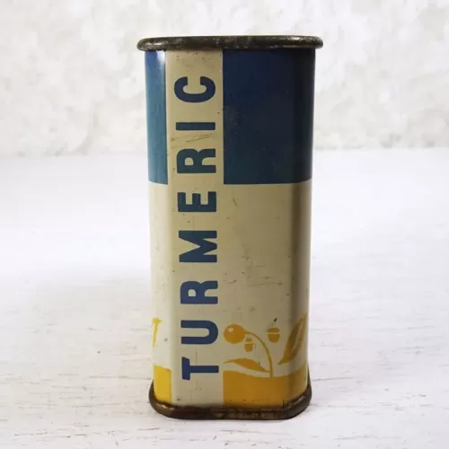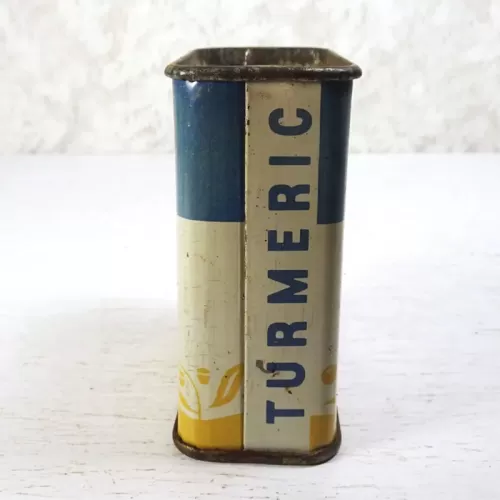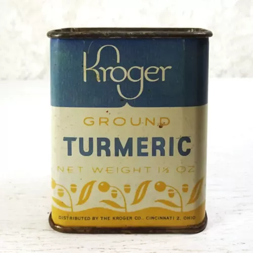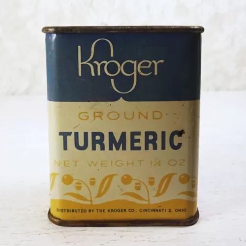 Vintage Kroger Ground Turmeric metal tin with slide top with holes on one side