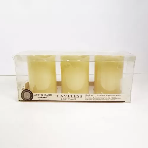 Three pack of cream colored LED pillar candles with realistic flickering light