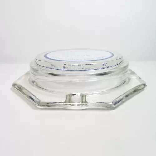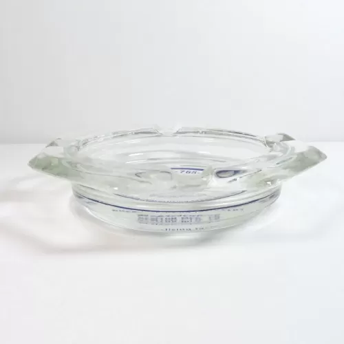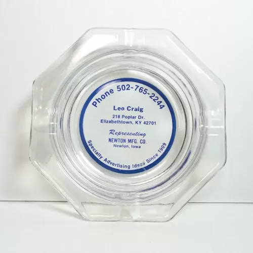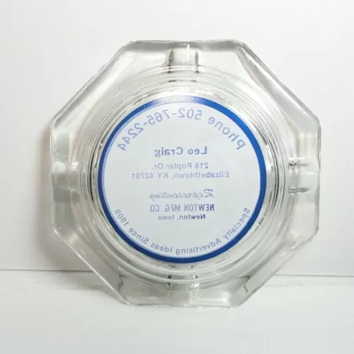 Leo Craig specialty advertising clear glass ashtray with an octagon shape, four cigarette rests and nice blue graphics