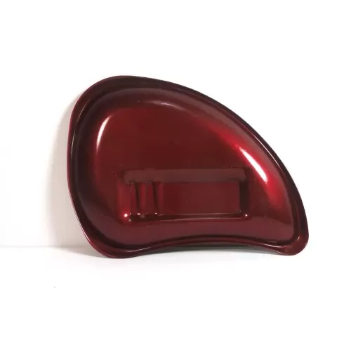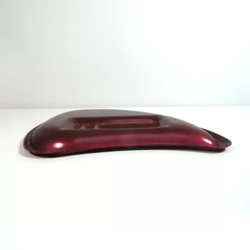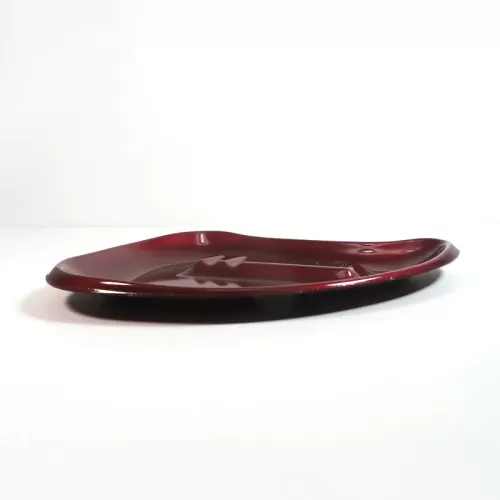 Vintage Lincoln Insurance Company metal ashtray featuring a unique shape and deep burgundy color with lighter graphics. The raised logo with three cigarette rests complete the look