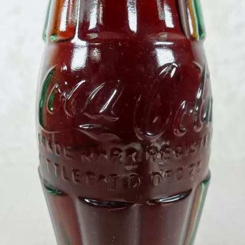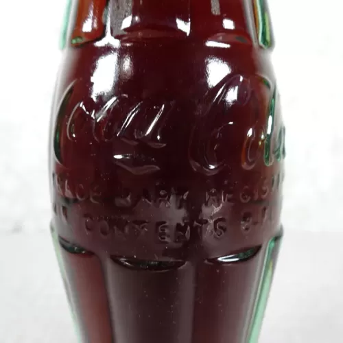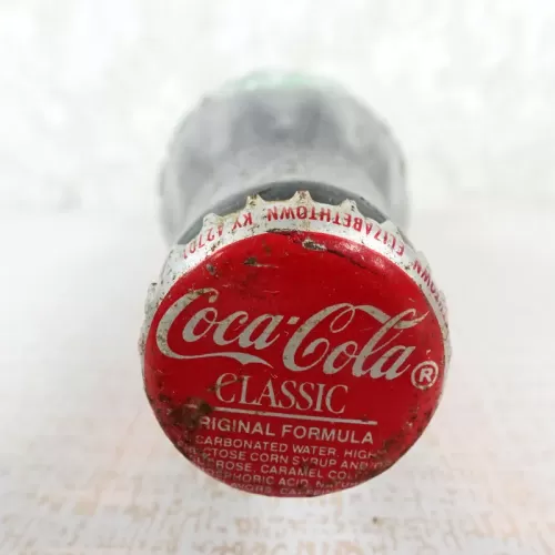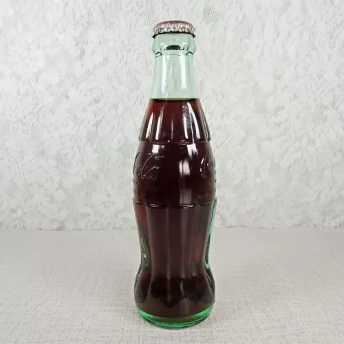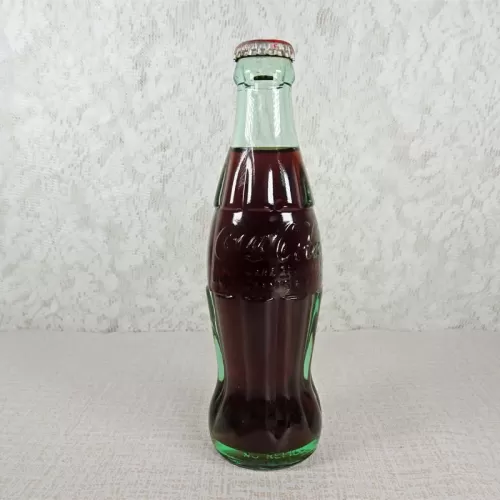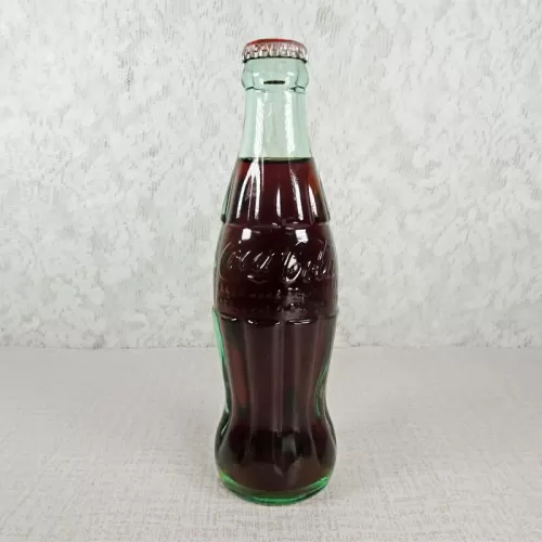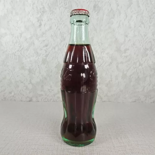 Coca Cola aqua green embossed vintage hobbleskirt glass soda bottle with a red Coca Cola Classic Original Formula crown sealed cap
